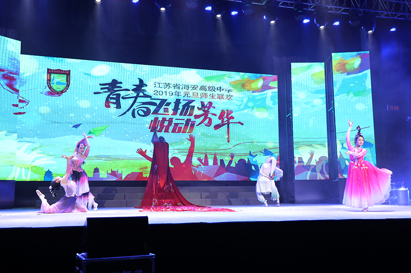 12月29日,海安高级中学举行了2019年“青春飞扬 悦动芳华”元旦师生文艺联欢。联欢会分下午、晚上两个专场,29日下午和晚上海中体艺馆内喜气洋洋,热闹非凡,全校师生欢聚一堂,高一、高二的同学们轮流享受了一场饕餮文艺盛宴。海安市委常委宣传部长严长江,海安市政府副市长彭晓红,海安市文广新局党组书记、局长华志刚,海安市教育工委书记、局长汪宁,海安市教育局副局长颜敏,以及全市各兄弟学校的领导、老师及家长朋友莅临了演出现场,与海中师生分享跨年的欢乐。