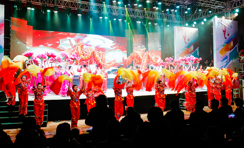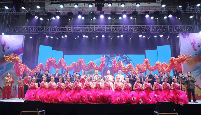 联欢会临近尾声时,学校校长、党委书记吕建,副校长杨斌、董裕华、吴明山、周峰及各位嘉宾走上舞台慰问全体演职人员,和全体演职员们合影留念,感谢他们的精彩表演和辛勤付出。