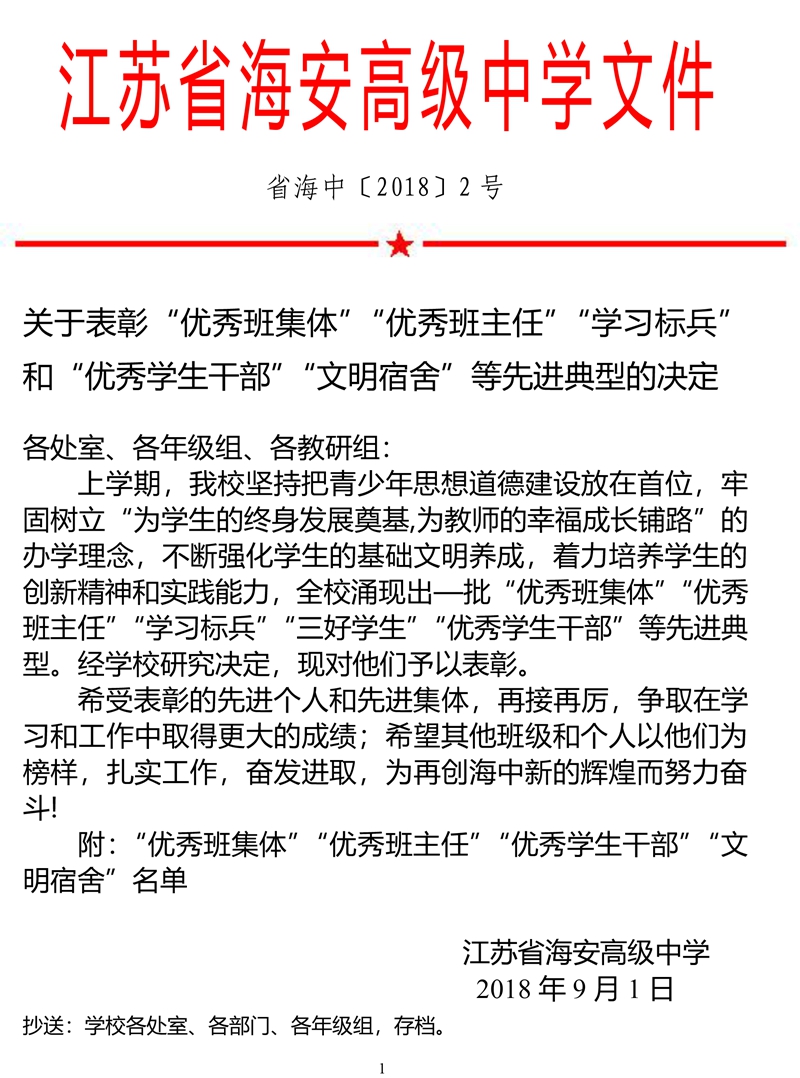 关于表彰“优秀班集体”“优秀班主任”“学习标兵”和“优秀学生干部”“文明宿舍”等先进典型的决定 来源: 发布时间:2018-09-01 00:00:00 浏览次数: 次 【字体:小 大】 分享到: 【打印正文】