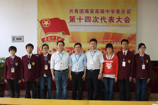 <!--?namespace prefix = st1 ns = "urn:schemas-microsoft-com:office:smarttags" ????-->2012年5月5日下午,共青团海安高级中学委员会于奥林匹克楼隆重召开了第十四次代表大会。来自全校46个班级的143名团员代表出席了大会,安保处主任顾玉华同志主持了大会,团委代书记顾庆华同志代表第十三届团委向大会做了工作报告,海安团县委副书记史文莉同志、校长助理董裕华同志出席大会并做了重要讲话。大会选举产生了第十四届省海中共青团委员会,顾庆华同志当选为新一届团委书记,蒋雅乐同学当选为新一届团委副书记,万芝锋、罗湘军、许尧、叶梦颖等8名同志当选新一届团委委员。<!--?namespace prefix = o ns = "urn:schemas-microsoft-com:office:office" ????-->