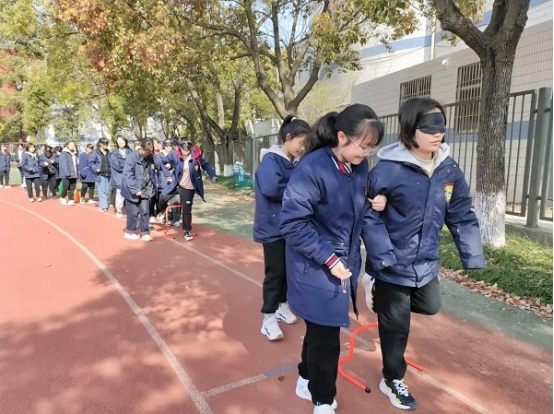 活动开始,心理老师对学生进行了排序分组,相邻两位同学作为搭档,一位戴上眼罩扮演“盲人”,另一位扮演不说话的拐杖。通过非言语信息帮助盲人穿越障碍,体验互助、信任、责任意识。